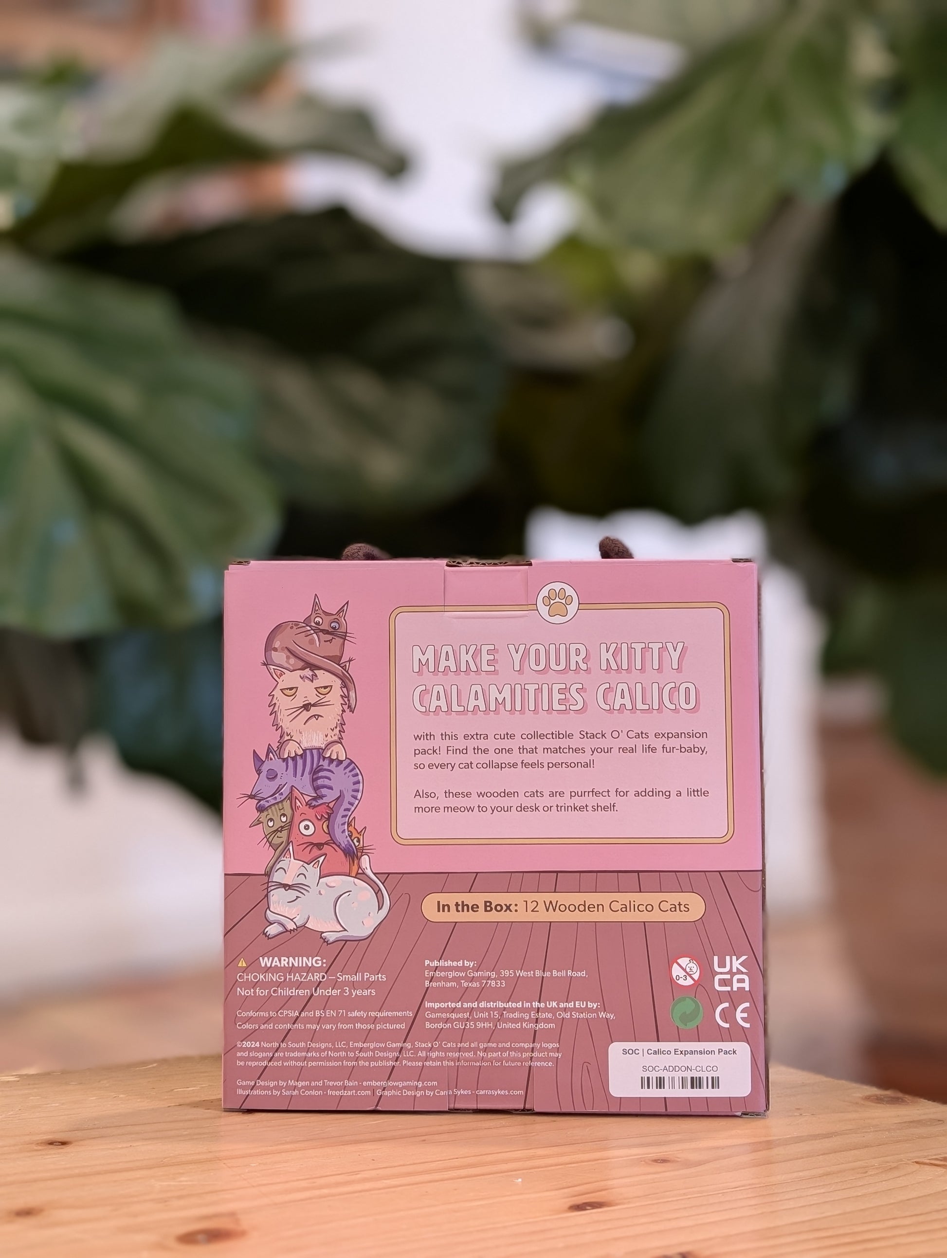 This expansion introduces 12 beautifully crafted wooden cat meeples, each featuring a unique, hand-drawn pattern designed by artist Sarah Conlon. Every Calico design has been carefully heat-pressed onto custom-cut cat shapes, giving your stack a burst of color and personality—especially if you’ve been waiting to bring your beloved Calico or multicolor kitty energy to the game. Each expansion comes with a matching velvety bag to carry your kitties in!